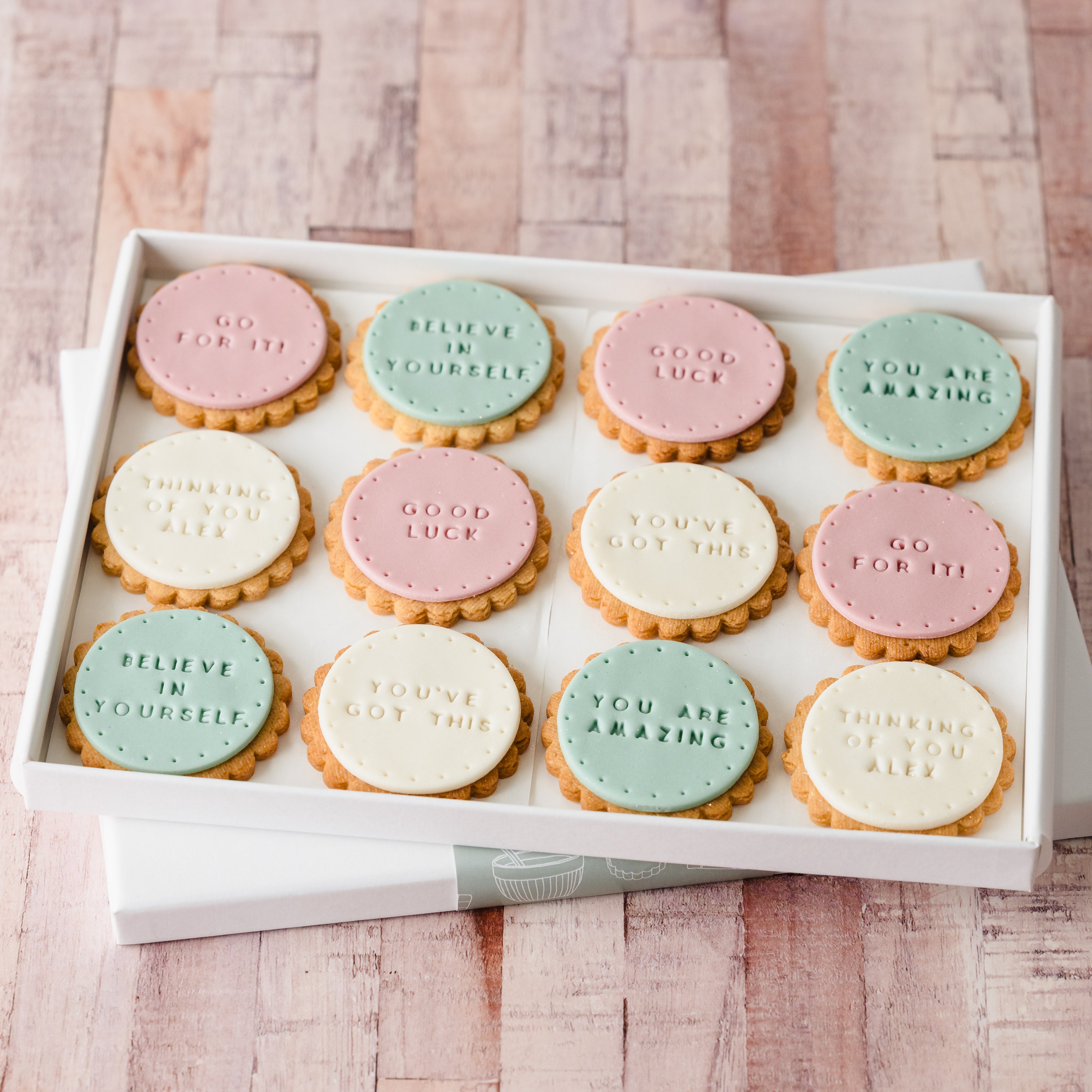 The perfect way to settle nerves - this box hand stamped personalised biscuits is a great way to let someone know you're thinking of them and wishing them good luck.