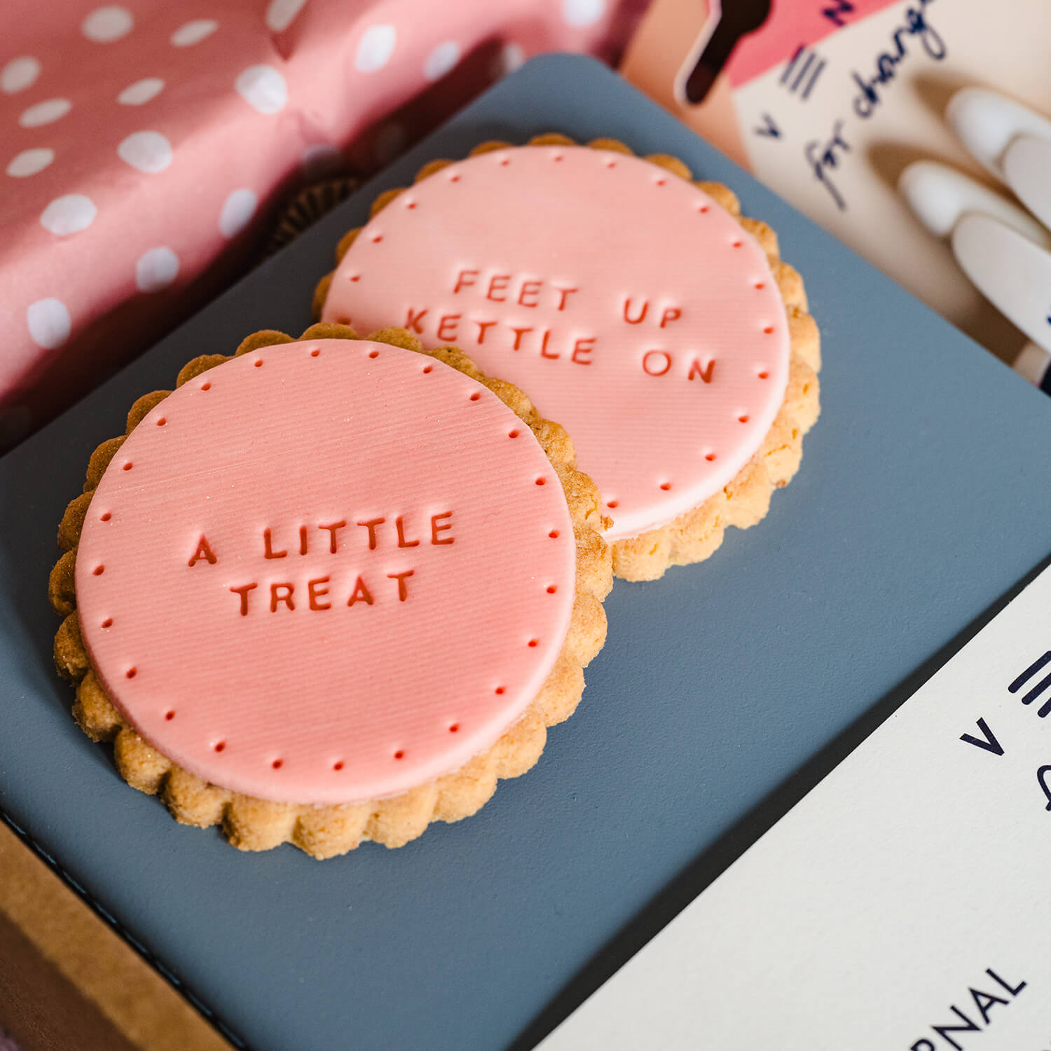 From our bakery in Rutland we make delicious vanilla biscuits and hand stamp each with a special message before gift wrapping them and sending them through the post to brighten someones day.