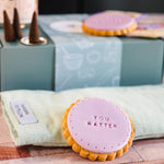 From our bakery in Rutland we make delicious vanilla biscuits and hand stamp each with a special message before gift wrapping them and sending them through the post to brighten someones day.