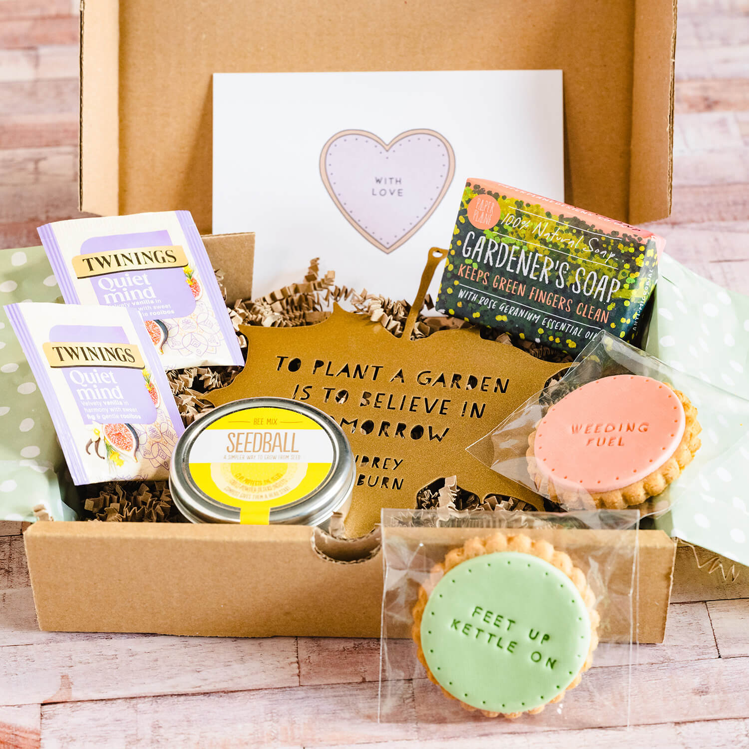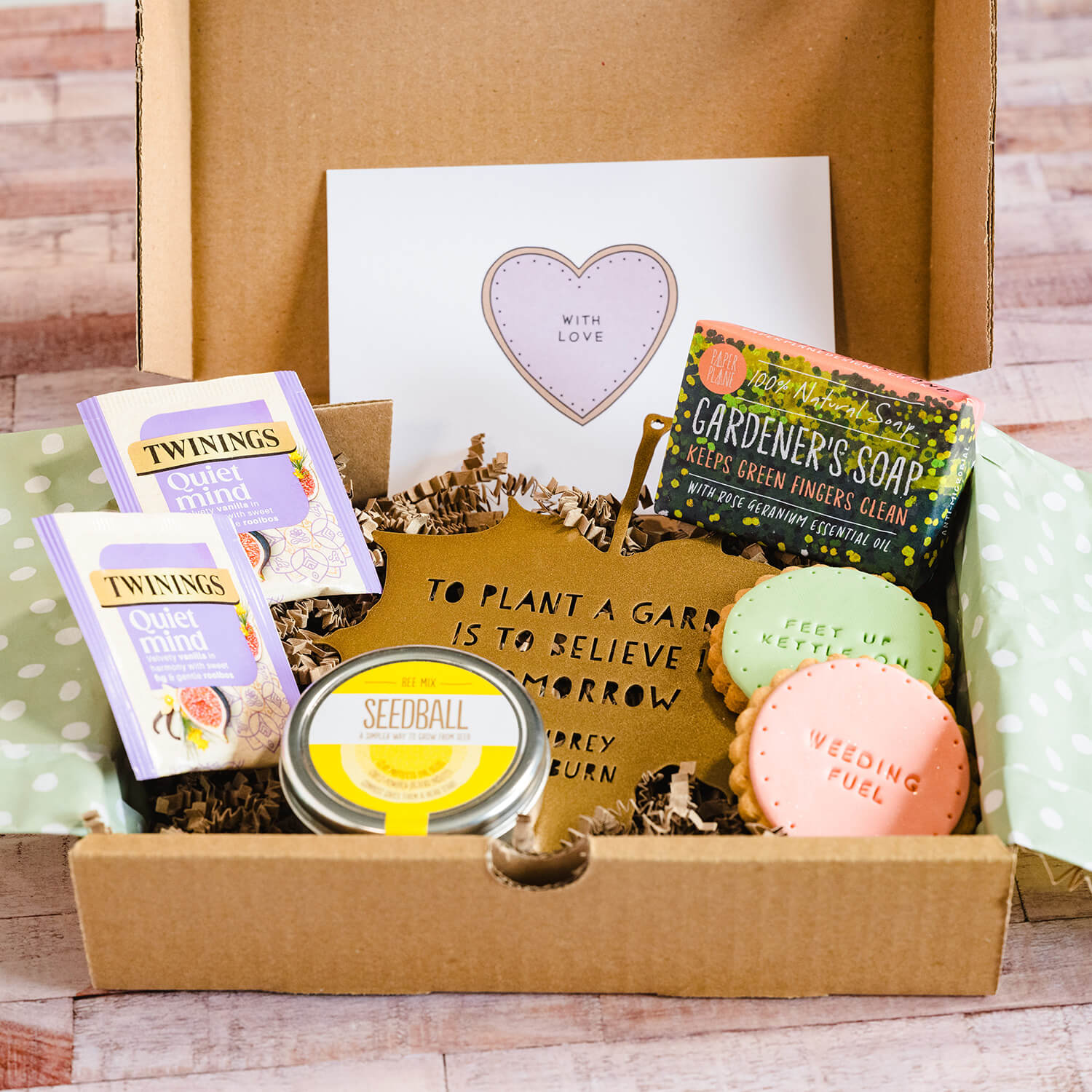 The perfect gift for the green fingered person in your life, this box contains carefully selected treats including wildflower seeds, a beautiful leaf quote, a gardeners soap and tea and biscuits to enjoy after all the hard work!