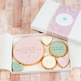 A delicious box of 6 vanilla iced biscuits, hand stamped with special messages and carefully gift wrapped with love.