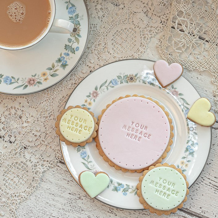 Uniquely created just for you, each of the round biscuits will be hand stamped with the message of you choice allowing you to send a gift that’s completely bespoke and personalised.